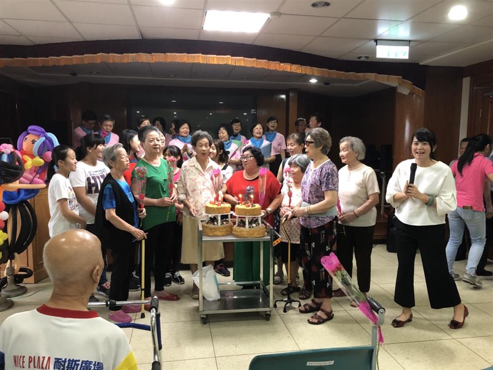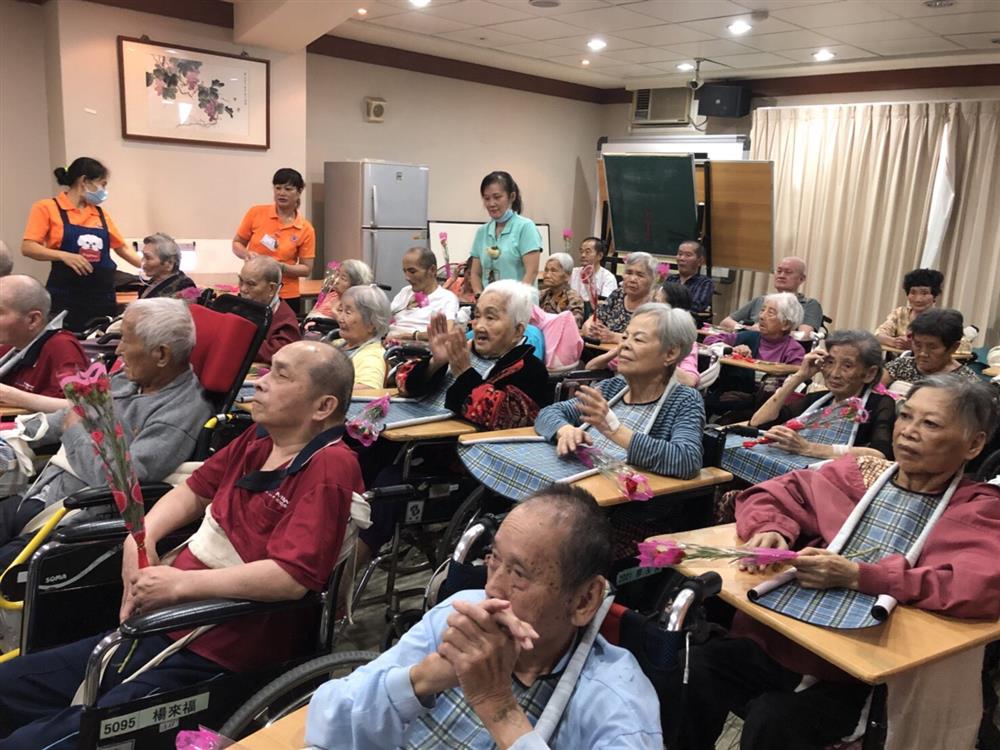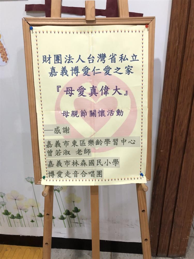 一年一度的母親節即將到來,本機構相當用心的為長輩們準備了一個溫馨的母親節活動,今年邀請嘉義市立林森國民小學的小朋友們一同與阿公阿嬤們慶祝母親節,林森國小的小朋友們也相當的用心,準備了一連串的舞蹈表演要讓阿公阿嬤們欣賞,小朋友也利用課餘時間製作手工餅乾義賣所的共5324元全數捐贈給本機構幫助弱勢長輩,而博愛走音合唱團也帶來五首有關於母親的歌曲,尤其在唱完「媽媽」這首,讓許多阿嬤都留下了感動的眼淚,本機構也趁這感人的時刻推出特地準備的雙層蛋糕來位長輩們慶祝。