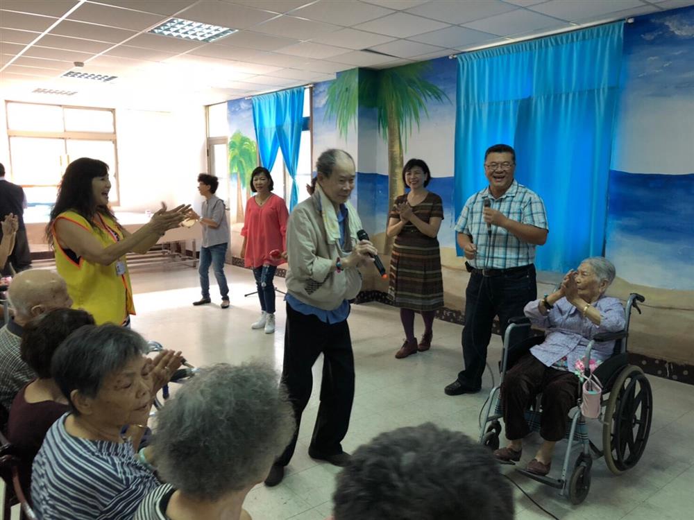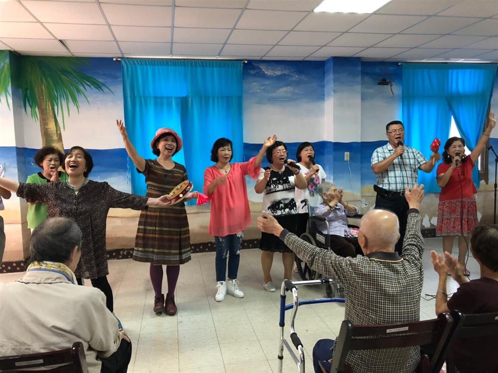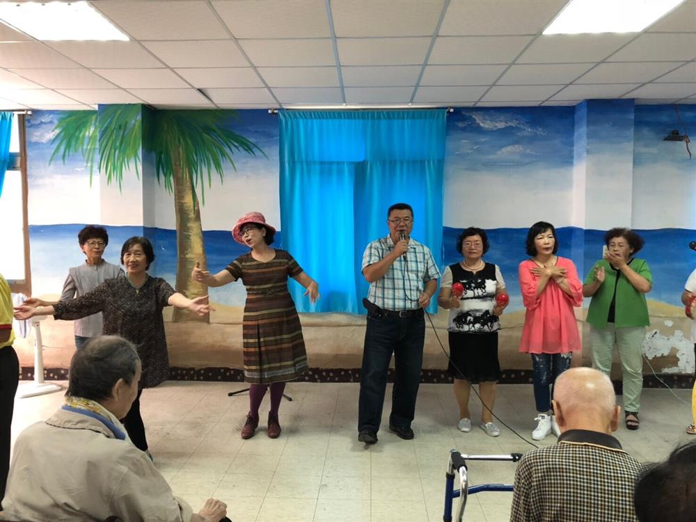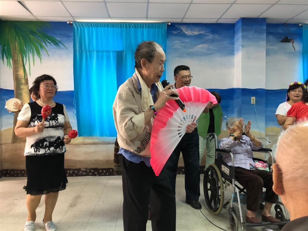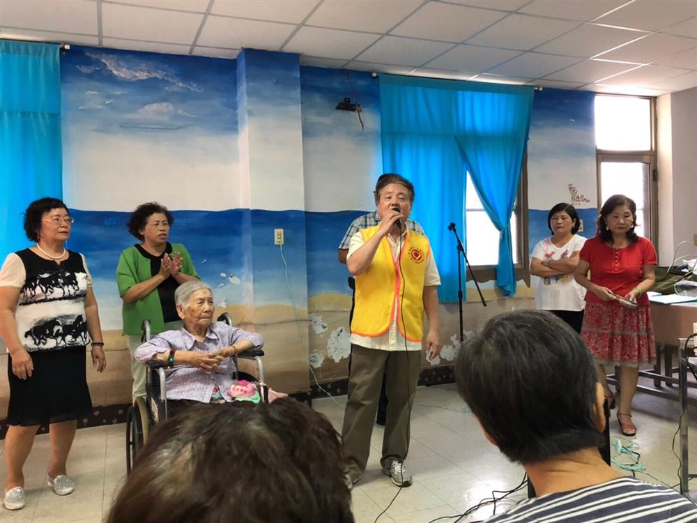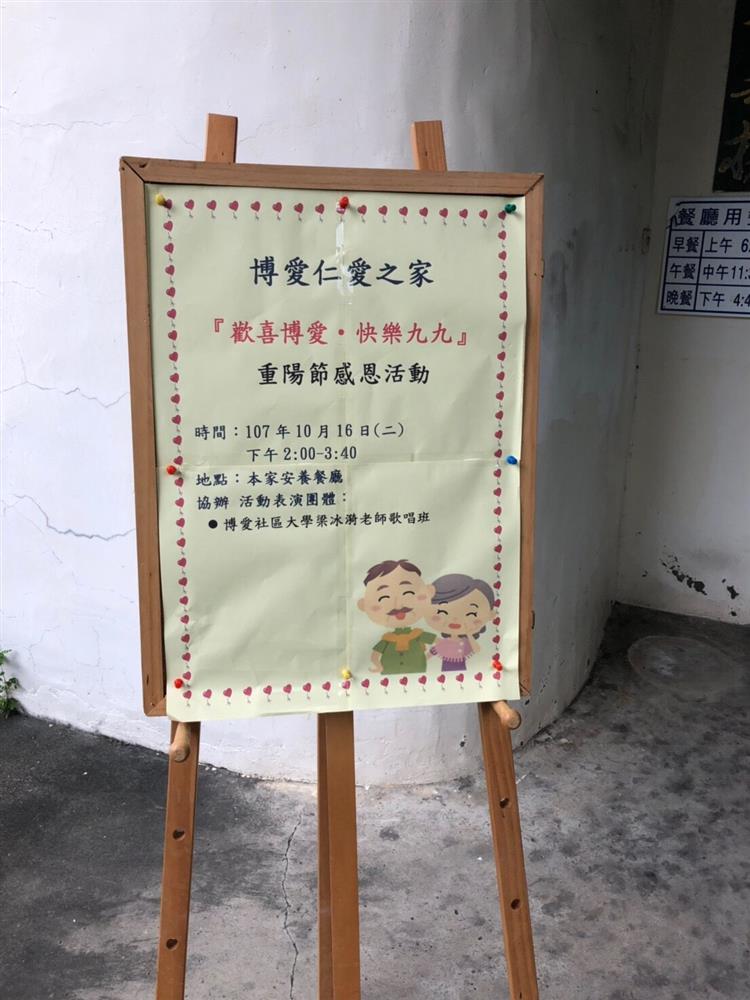 節慶活動 107.10.16『歡喜博愛•快樂九九』重陽節活動 107.10.16感謝「嘉義東區樂齡學習中心」贈送本機構長輩們100顆壽桃,長輩們每位都相當的高興,稱讚壽桃非常的好吃,而「博愛社區大學-梁冰漪老師歌唱班」勁歌熱舞的帶來多首歌曲,而本機構長輩也一起上台表演唱歌,活力十足,本機構志工團長也帶來一首日語歌曲,大獲現場熱烈好評,最後梁老師與長輩們一同合唱”外婆澎湖灣”來結束歡樂的時光。