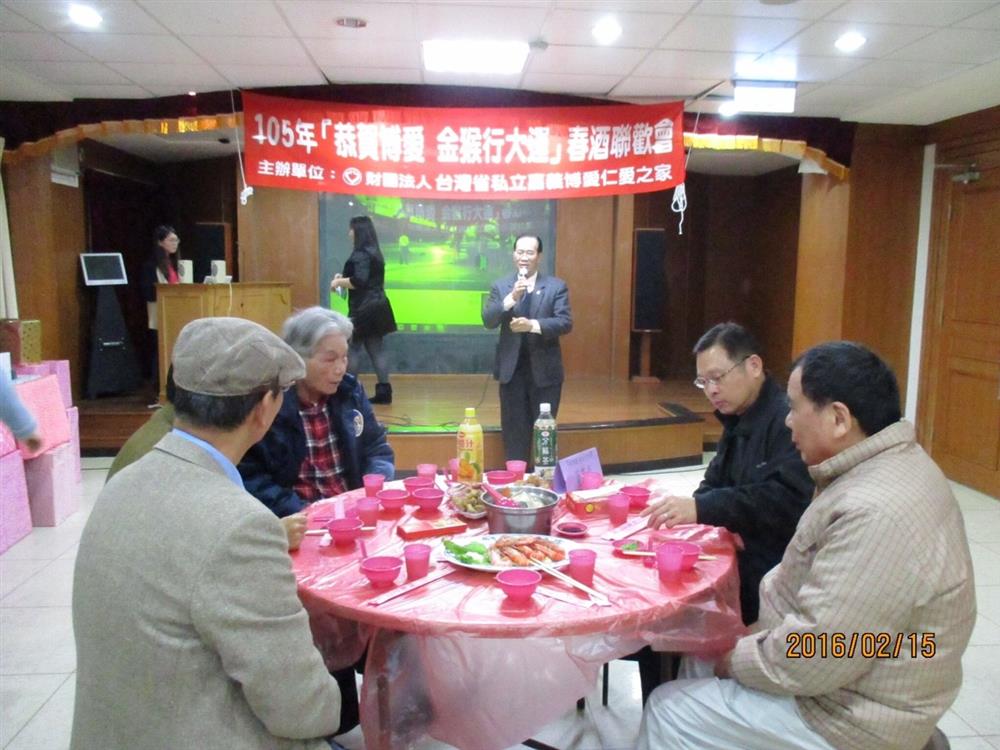 節慶活動 105年「恭賀博愛 金猴行大運」春酒聯歡會 105/2/15一年的開始,雖然有部份成員在過年期間仍需輪值班,但二月十五初八天氣晴,氣溫冷了點,卻絲毫不減全體的熱情。 董事會的致詞為活動拉開序幕,現場陸續抽出的神秘獎品也將現場的氣氛炒熱致高點,同事賣力且精彩的演出,讓大家都沉浸在歡樂中,尤其是社工組的獎品讓所有人滿載而歸。 感謝董事長丶顧問丶各組工作人員,讓活動圓滿順利的進行。